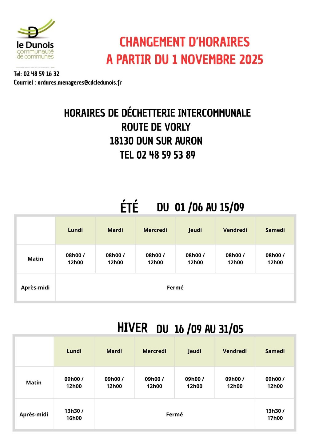 Nous vous informons que les horaires de la déchèterie de Dun-sur-Auron seront modifiés à compter du 1er novembre 2025.