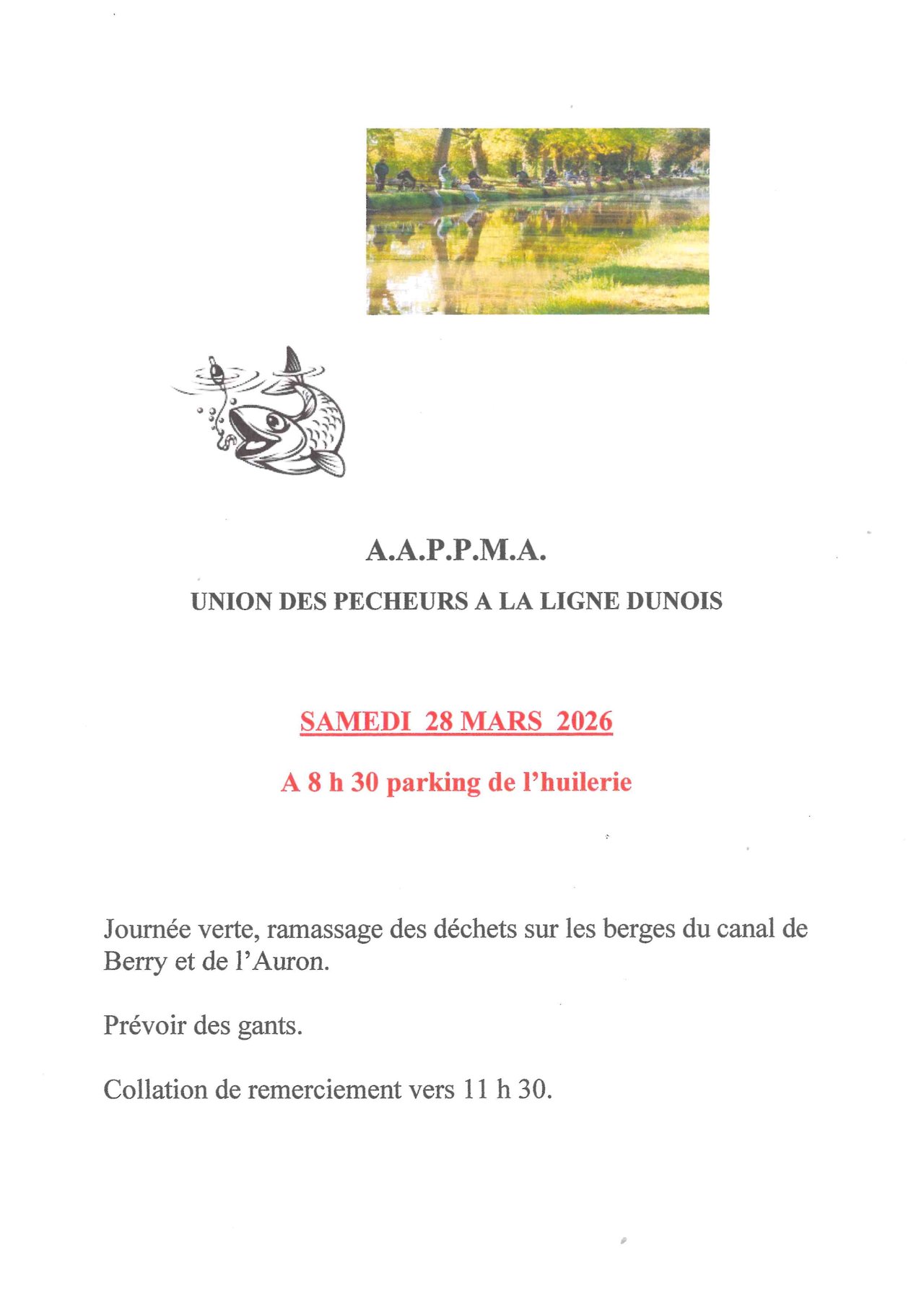 L'Union des Pêcheurs à la Ligne Dunois organise une matinée verte "Ramassage des déchets sur les berges du Canal de Berry et de l'Auron", Samedi 28 Mars 2026. Rendez-vous à 08h30 au parking de l'Huilerie d'Auron.