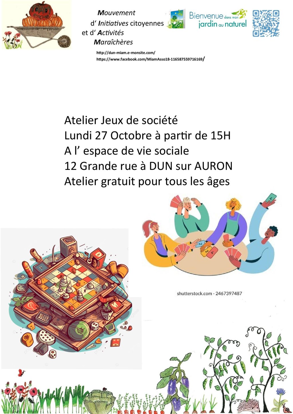 Le Mouvement d'Initiative citoyennes et d'Activités Maraîchères organise un atelier "Jeux de société", Lundi 27 Octobre 2025 à 15h00, à leur espace de vie sociale "Au potager du MIAM" situé au 12 Grande Rue.