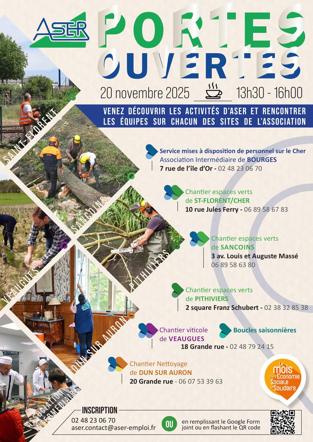 L'Association Solidarités Emplois Ruraux (ASER) organise ses portes ouvertes, Jeudi 20 Novembre 2025 de 13h30 à 16h00, dans leurs locaux situés au 20 Grande Rue à Dun-Sur-Auron.