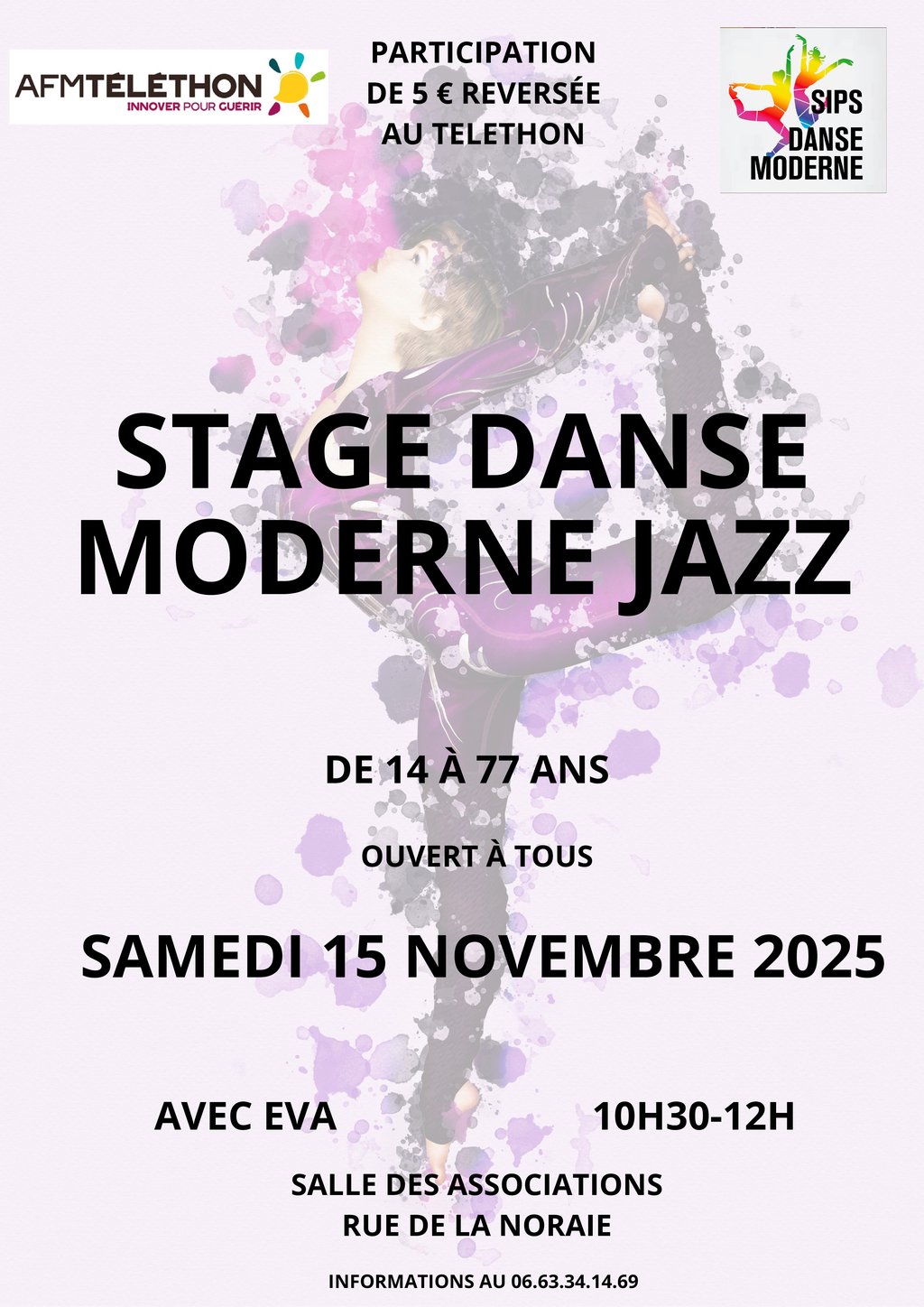Dans le cadre des actions menées en faveur du Téléthon, la section Danse Moderne de la SIPS organise un stage de danse moderne jazz avec Eva, Samedi 15 Novembre 2025 de 10h30 à 12h00, dans la salle des associations de l'espace Bernard Boussard situé Rue de la Noraie.