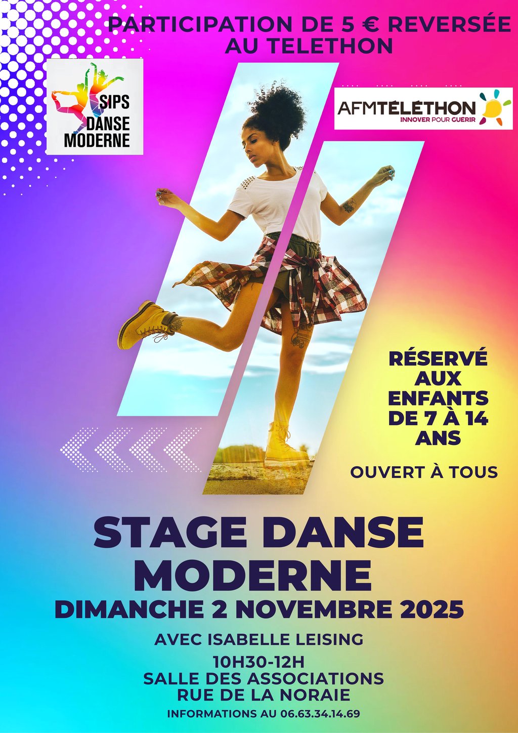 Dans le cadre des actions menées en faveur du Téléthon, la section Danse Moderne de la SIPS organise un stage de danse moderne avec Isabelle Leising, Samedi 02 Novembre 2025 de 10h30 à 12h00, dans la salle des associations de l'espace Bernard Boussard situé Rue de la Noraie.