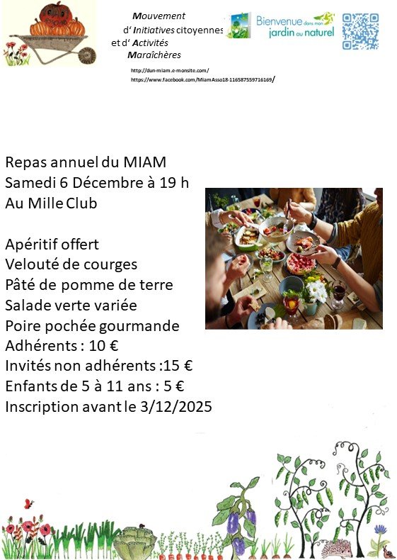 Le Mouvement d'Initiative citoyennes et d'Activités Maraîchères organise son repas annuel, Samedi 06 Décembre 2025 à 19h00, dans la salle du Mille Club située Place du Bief.