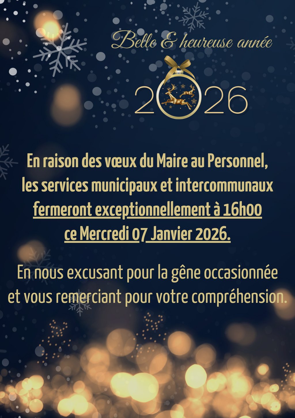 En raison des vœux du Maire au Personnel, tous les services municipaux et intercommunaux fermeront exceptionnellement ce Mercredi 07 Janvier 2026 à 16h00.