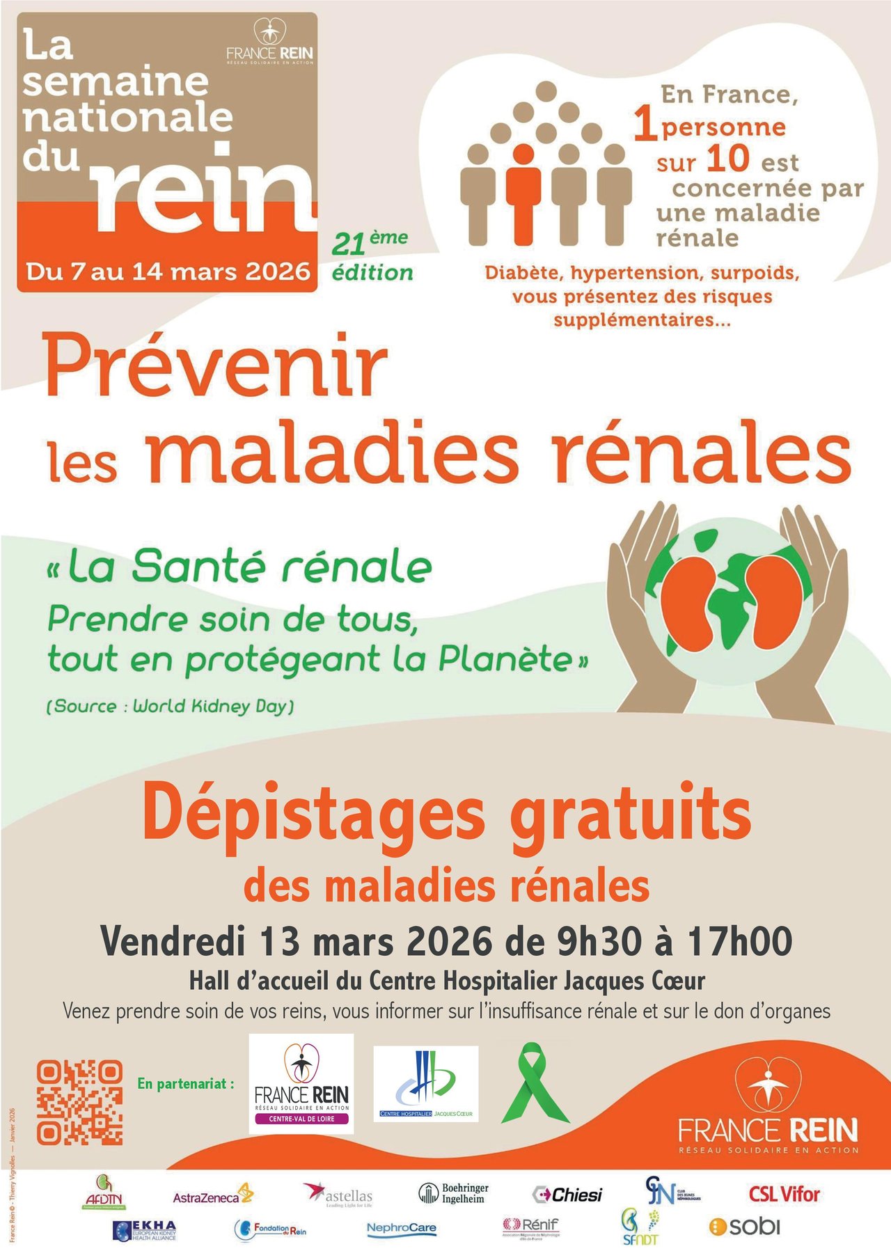 France Rein organise une journée de dépistages gratuits des maladies rénales, Vendredi 13 Mars 2026 de 09h30 à 17h00 dans le hall d'accueil du Centre Hospitalier Jacques Coeur de Bourges.