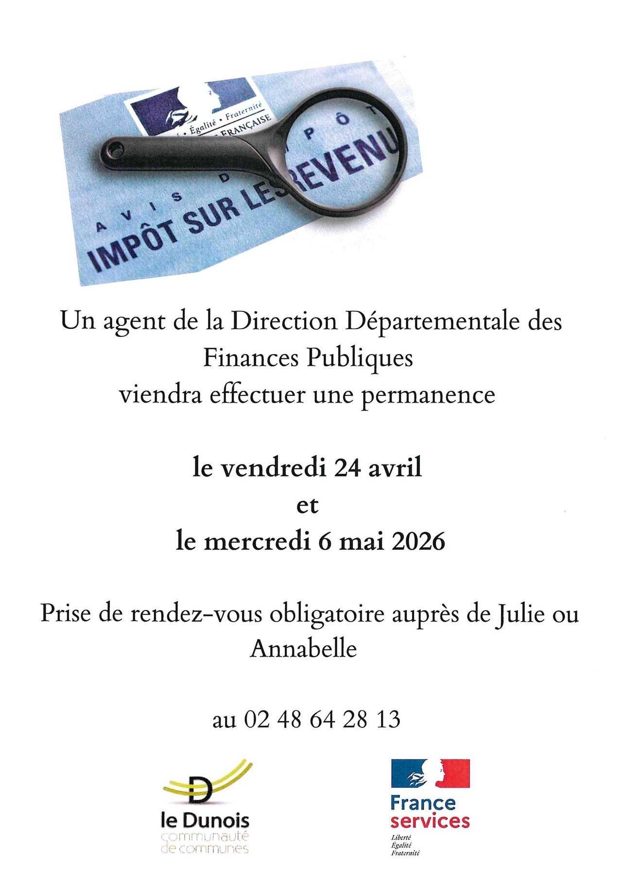 La structure France Services organise une permanence avec un agent de la Direction Départementale des Finances Publiques, Mercredi 06 Mai 2026 toute la journée, dans leurs locaux situés Rue Jean-Marie Heurtault De Lammerville à Dun-Sur-Auron.